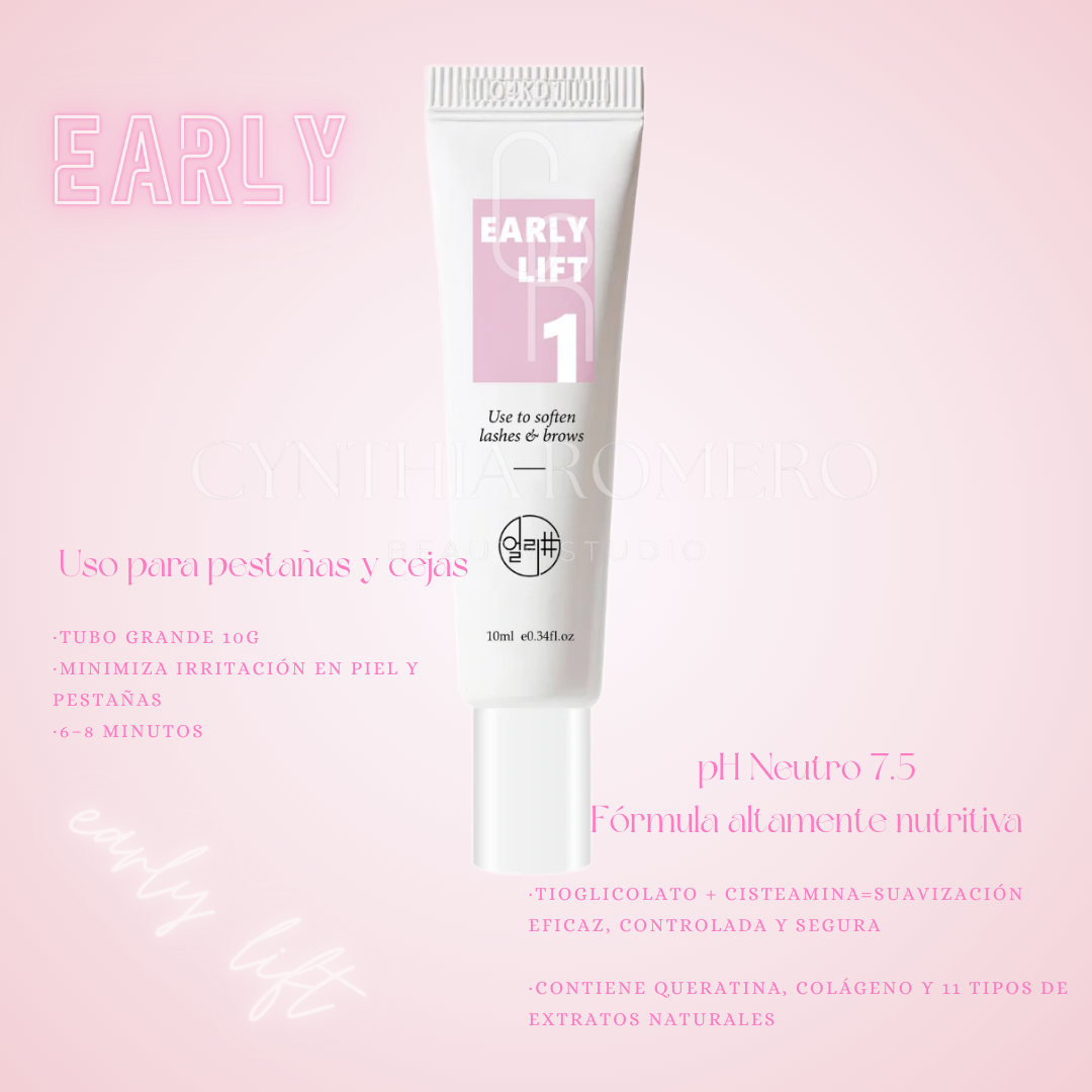 Early Lift Paso 1 es la loción profesional del lifting de pestañas coreano con pH 7,5 y textura crema antigoteo. Su combinación de cisteamina + tioglicolato moldea con precisión mientras cuida la pestaña gracias a colágeno + queratina + 11 extractos botánicos. Ahorra tiempo (6–8 min) y aporta una experiencia segura para el profesional siguiendo el protocolo del sistema.